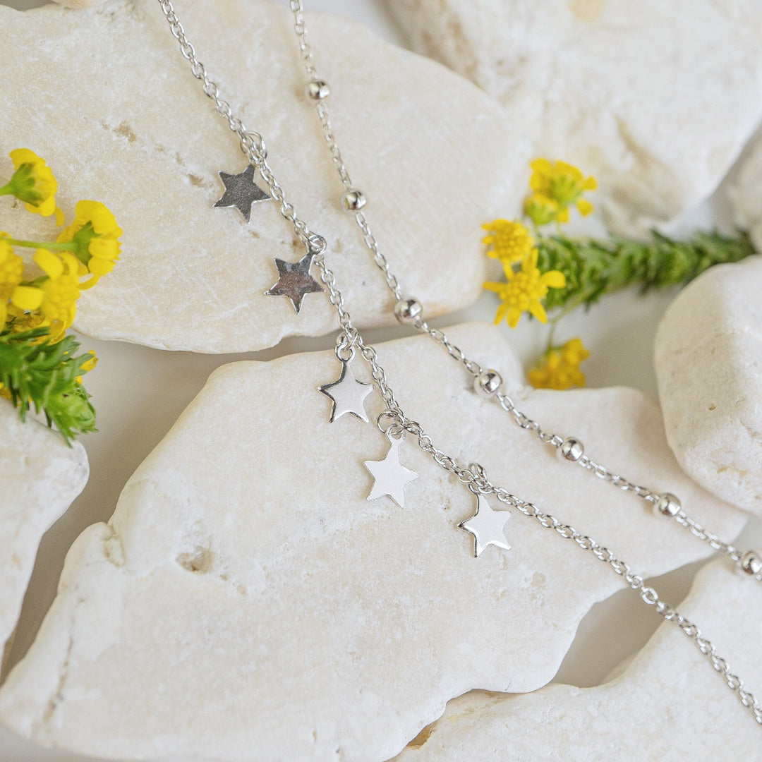 Let your spirit soar with the Cosmic Duo Anklet, where two sterling silver chains intertwine in celestial harmony. One chain dances with delicate silver stars, while the other sparkles with tiny silver balls, creating a constellation of charm around your ankle. With an extension chain for a perfect fit, this anklet captures the magic of the cosmos, inviting you to step into the starlit night with a heart full of wanderlust.