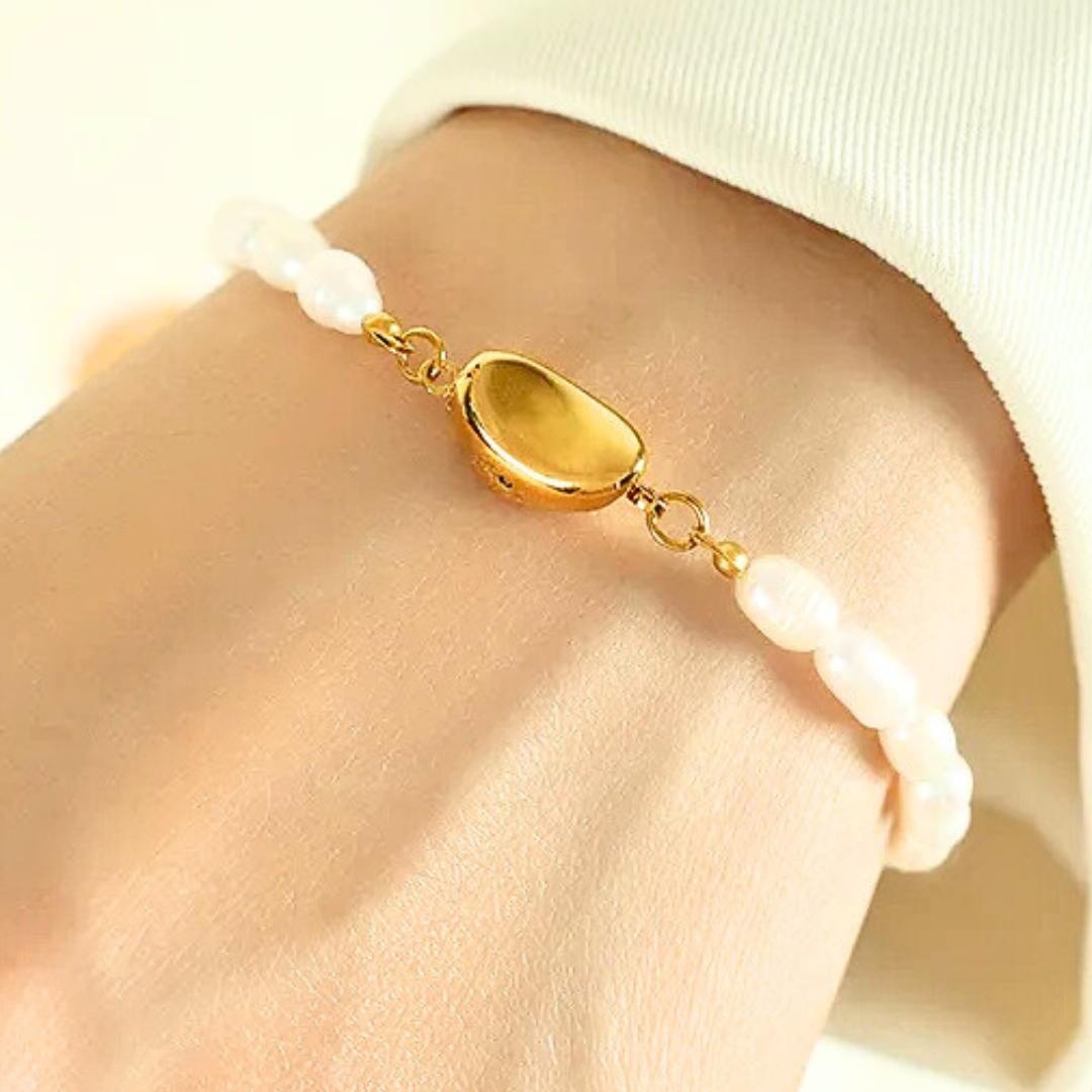 Effortlessly timeless, the Pure Pearl Bracelet is designed for everyday wear. Soft, natural pearls are paired with a beautifully secure gold clasp that’s made to move with you — waterproof, durable, and worry-free. Whether worn solo for a clean, classic look or layered with your favourite pieces, this bracelet brings a gentle glow to your wrist and a sense of calm elegance to every moment. A true everyday essential, made to be lived in.