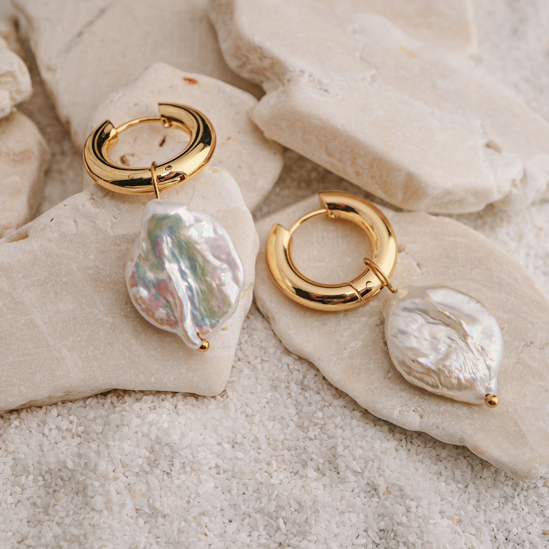 These Baroque Pearl Earrings are a celebration of raw elegance and ocean-born beauty. Featuring large, luminous freshwater pearls — each one completely unique — they float effortlessly from polished gold huggie hoops, catching the light with every movement. Their organic, sculptural form makes them a true statement piece, blending coastal soul with modern luxury. Bold yet timeless, these earrings are designed for those who move confidently between barefoot days and golden-hour nights, carrying the untamed beauty of the sea wherever they go.