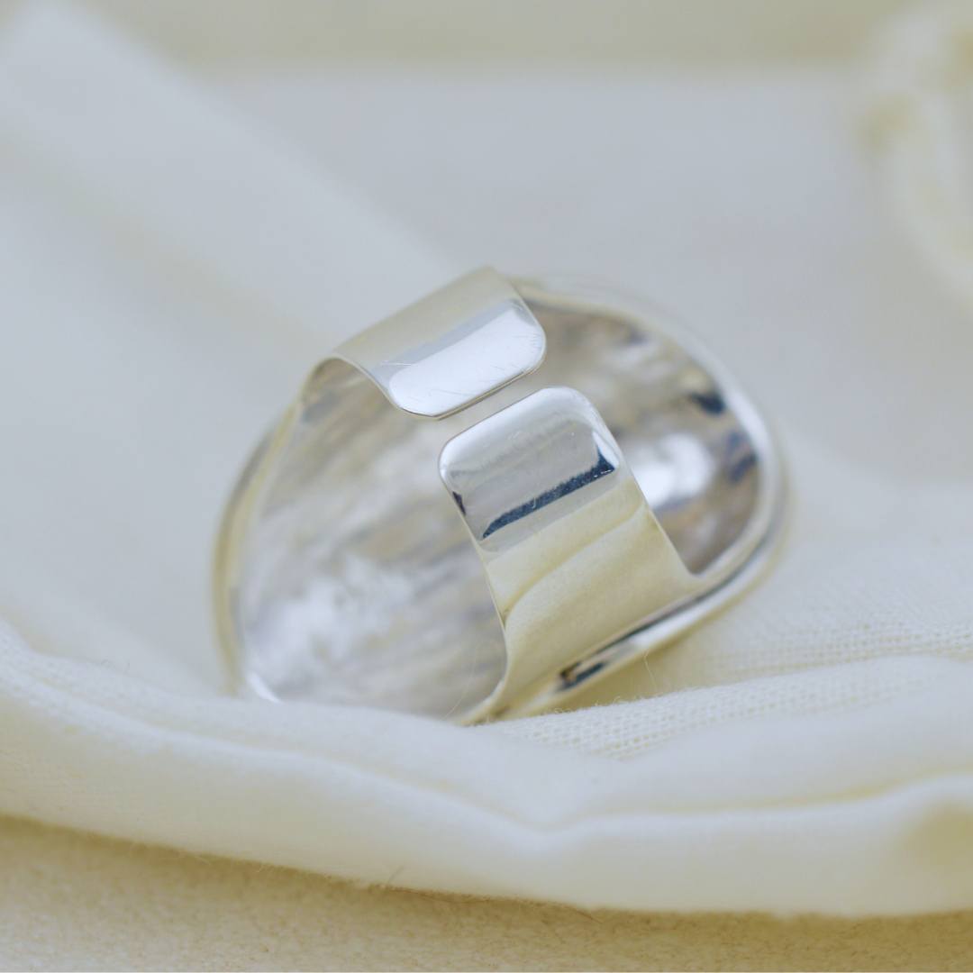 The Elemental Shield Ring is a bold sterling silver statement piece that radiates strength and free-spirited energy. Its large hammered shield design curves gracefully around the finger, catching the light with every movement, while the tapered open band ensures both comfort and an adjustable fit made just for you. Powerful yet effortless, this ring feels like wearing a piece of the earth’s raw beauty — a talisman of courage, freedom, and untamed spirit.