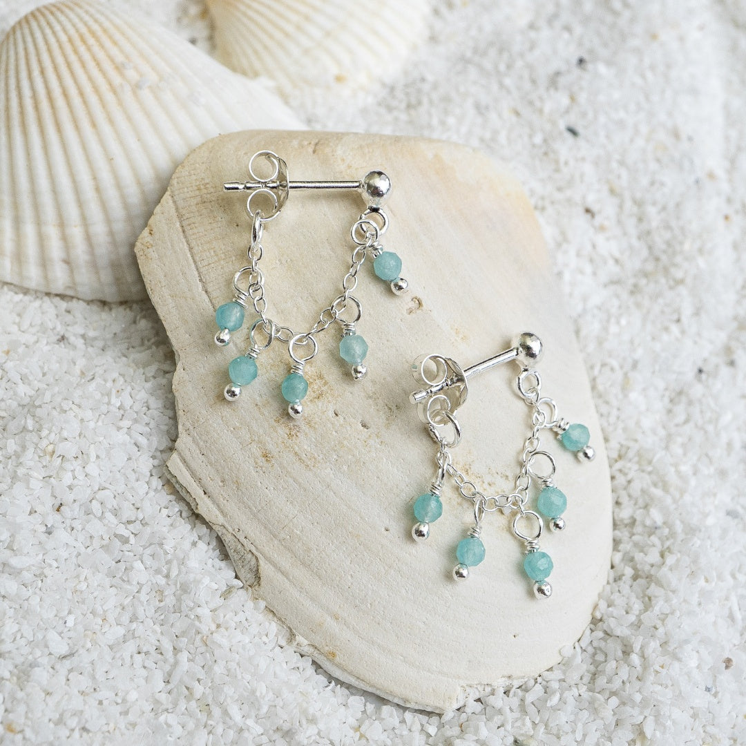 Elevate your vibe with our enchanting Amazonite Mini Bead stud earrings! These whimsical treasures are meticulously crafted from sterling silver, boasting dainty studs that delicately cradle gorgeous amazonite beads. What sets these earrings apart is the fine chain that playfully connects from the front of the stud to the backing, creating a mesmerising dance of colour and movement that gracefully hangs beneath your earlobe. Embrace the carefree spirit of these earrings and let them whisk you away to a world of effortless elegance and charm.