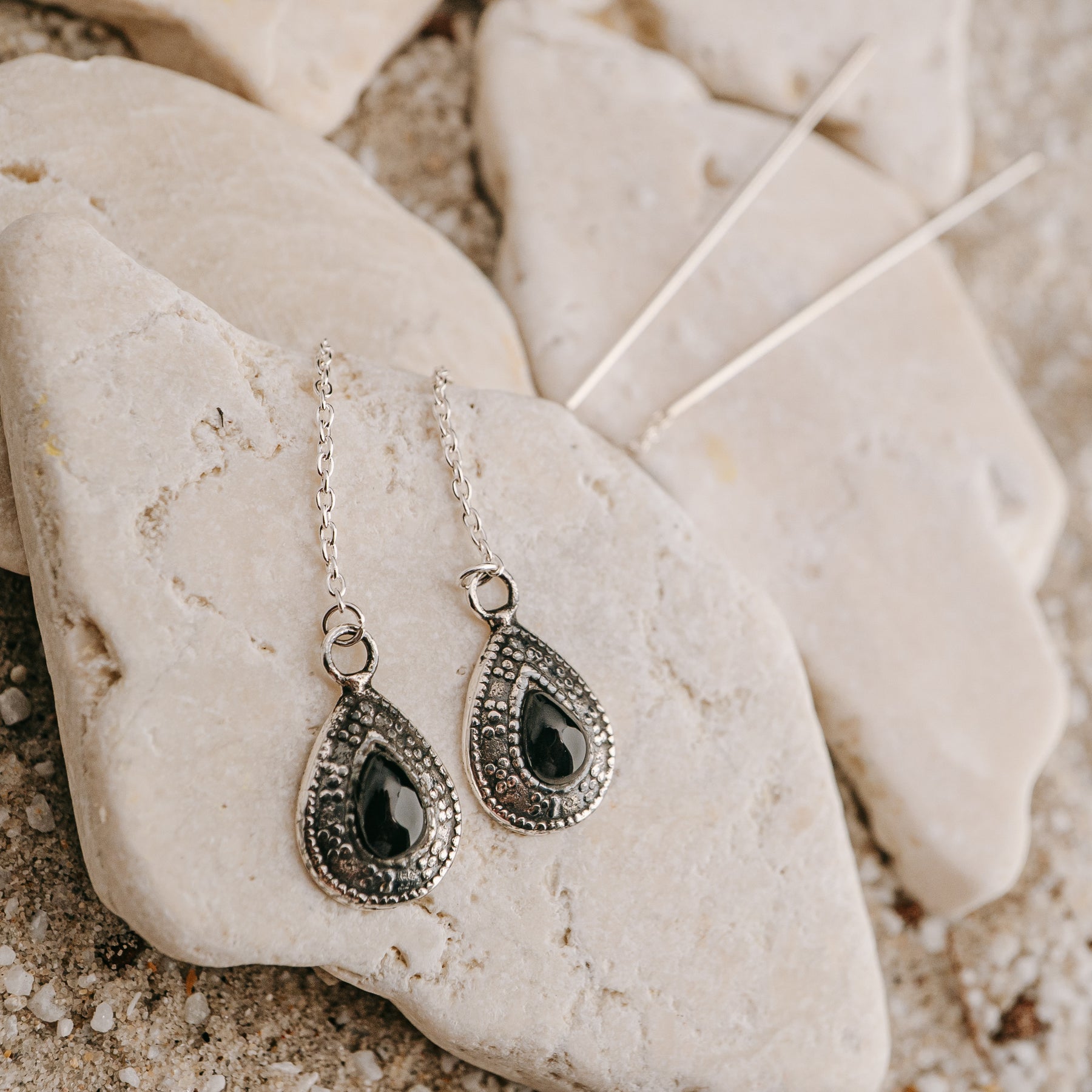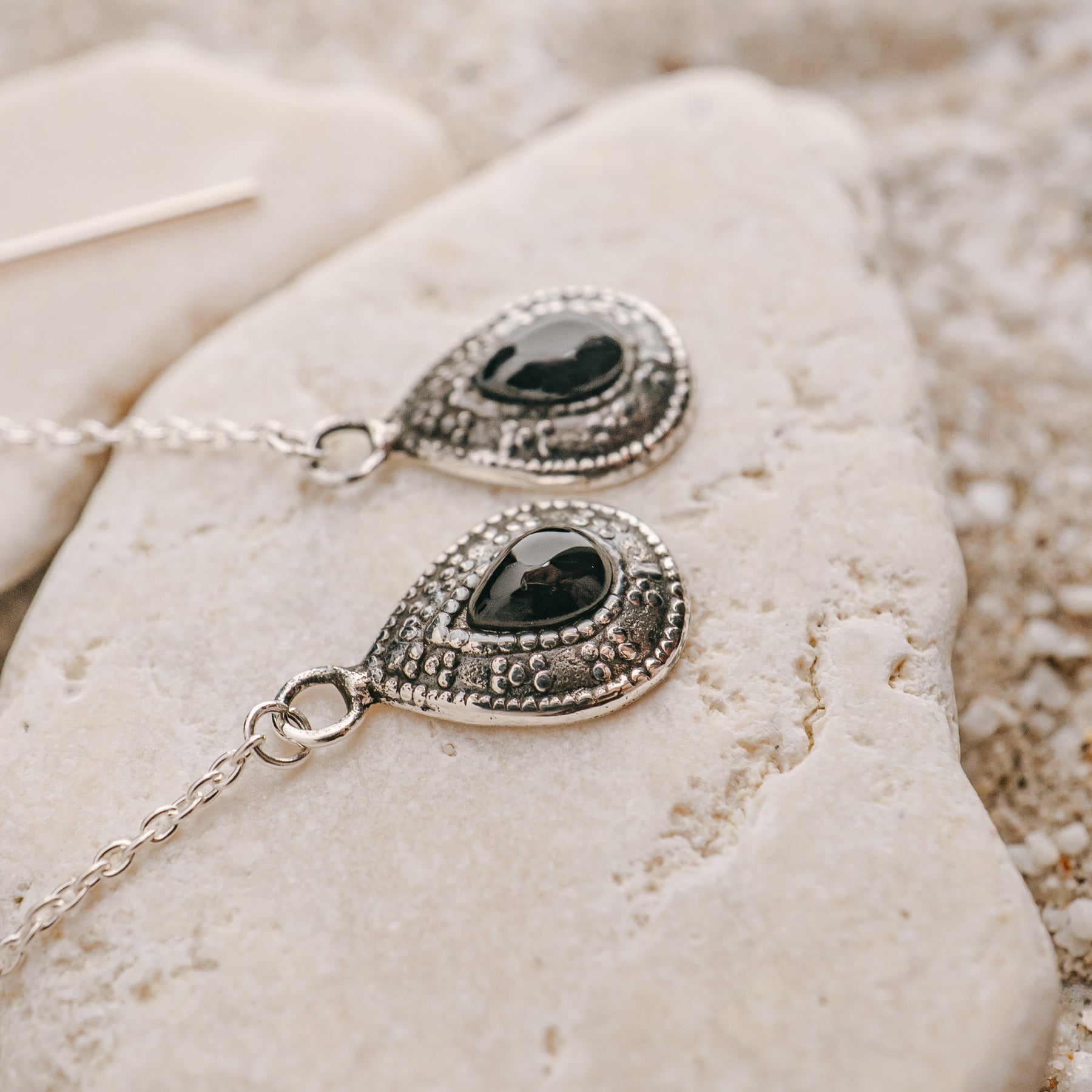 Indulge in the essence of bohemian bliss with our Bohemian Bliss Thread Earrings, a sterling silver design that beckons to your wandering soul. Each earring features a petite teardrop that elegantly attaches to a fine silver cable chain and rod, creating a captivating thread-through design that dances with every sway. The teardrop itself is a treasure chest, with a shiny black insert framed by a raised pattern and a whisper of oxidised finish, exuding a sense of ageless allure.