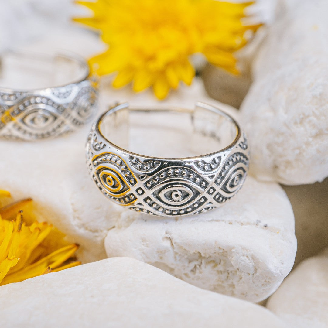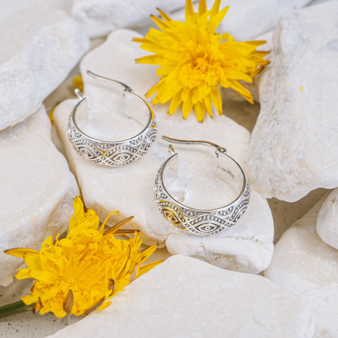The Eye of Protection Hoop Earrings are more than just a style statement—they are a guardian for your spirit. Crafted from sterling silver, these wide hoops carry an oxidised evil eye pattern along their curved surface, a symbol long believed to ward off negativity and invite divine protection. With a secure lever closure, they are the perfect everyday companions, keeping your energy shielded while adding a touch of soulful beauty to your vibe.