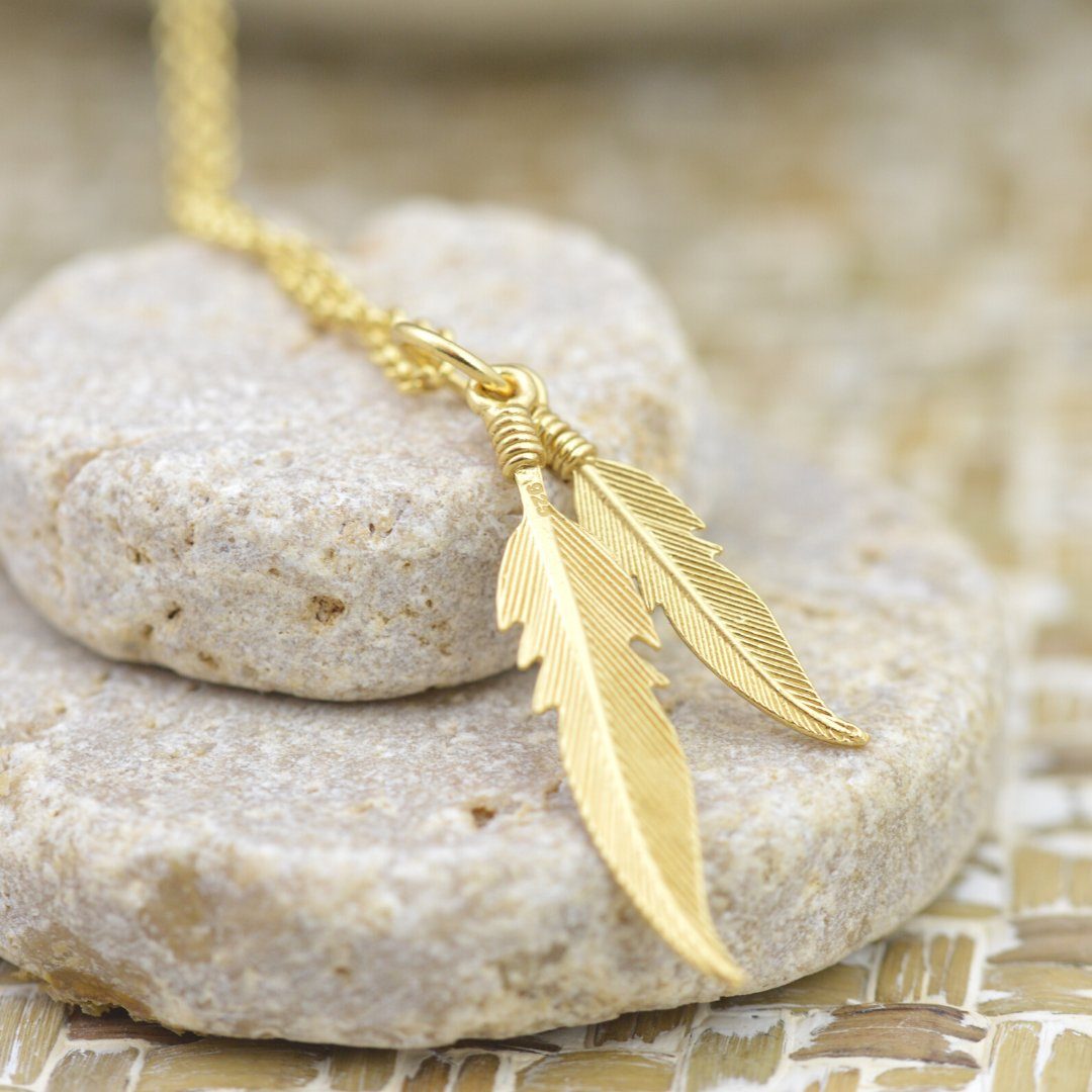 Embrace the spirit of untamed wanderlust with our Gold Double Charm Feather Necklace. This exquisite piece encapsulates the essence of freedom and adventure, featuring not just one, but two feather charms gracefully suspended from a delicate cable chain. These feathers represent the boundless beauty of nature and the soaring spirit within us. Wear this necklace as a reminder to chase your dreams, embrace your inner nomad, and dance to the rhythm of your own wild heart. It's a symbol of the unbridled, free-spirited soul, and a fashion statement that celebrates the call of the open road. With our Gold Double Charm Feather Necklace, you carry a piece of the wilderness wherever you go, a precious emblem of your bohemian spirit. The feather is also a symbol that connects us to loved ones.