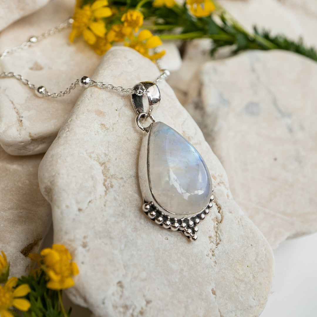 Embark on a journey of spiritual elegance with our Bohemian Moonstone Necklace, where a magnificent large teardrop Rainbow Moonstone takes center stage within a sterling silver bohemian setting. This handmade pendant is a masterpiece that captures the essence of cosmic enchantment, as the moonstone's ethereal glow reflects the mysteries of the universe. The intricate detailing of the sterling silver ball and cable chain adds character to this timeless necklace, turning it into a wearable symbol of divine connection. Adorn yourself with the Bohemian Moonstone Necklace and let its spiritual energy guide you through moments of serenity and introspection, allowing the moon's magic to resonate with the free spirit within.
