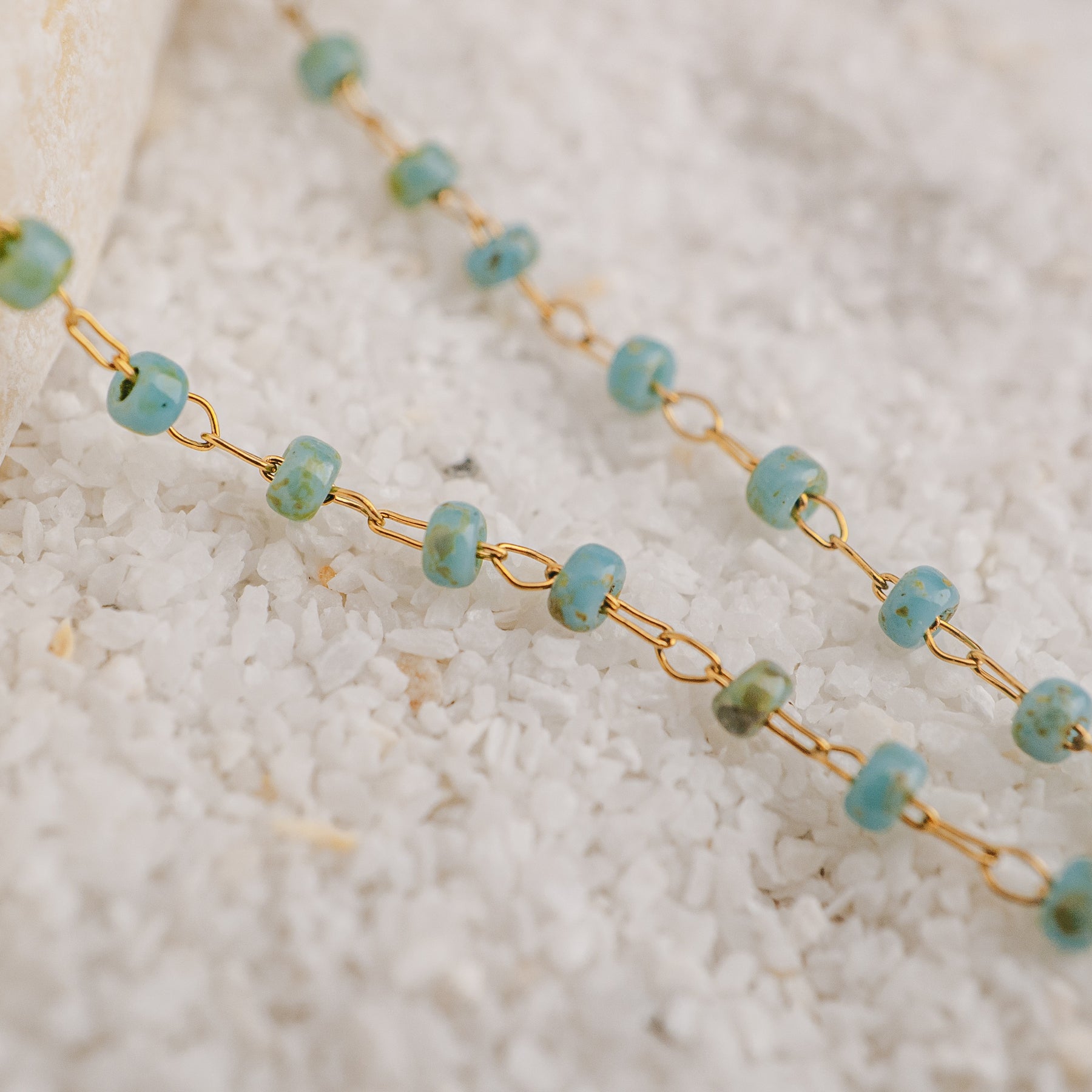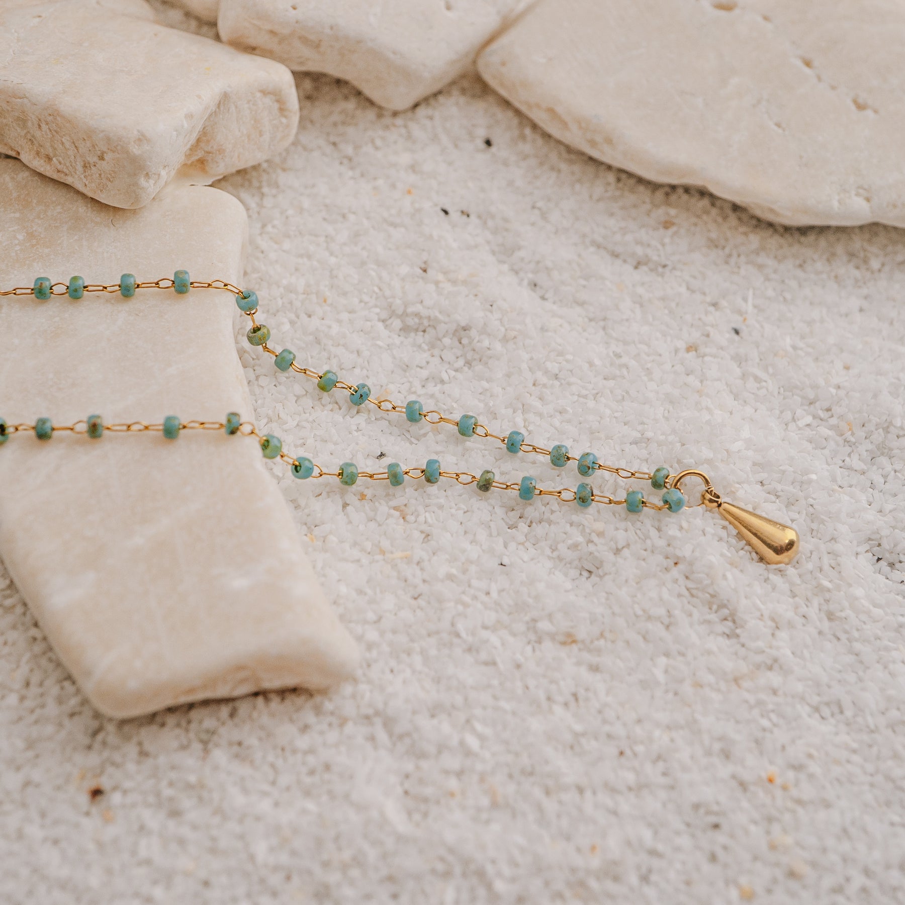 The Ocean Drop Necklace is a delicate tribute to sunlit seas and gentle tides. Tiny aqua-toned beads flow effortlessly along the neckline, finished with a single golden drop charm that catches the light with every movement. Lightweight and dainty, this piece feels barely there — perfect for ocean days, sun-soaked afternoons, and warm summer nights. Worn alone or layered with your favourite chains, it brings a soft, ocean-kissed glow to every look.