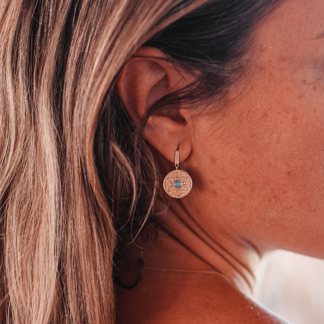 Meet the Golden Boho Drops — a dreamy fusion of sunshine and soul. These light and breezy earrings feature a golden disc etched with bohemian charm, anchored by a tiny turquoise stone at the heart. Dangling gently from a slender gold bar, they shimmer with a carefree spirit, made for golden hour wanderings and wild-hearted days.