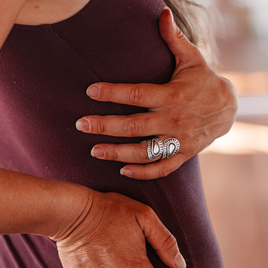 A bold embrace of spirit and strength, the Tribal Wrap Ring coils around your finger like an ancient symbol of power. Its sterling silver form curves with confidence, where two ends meet at the front in a fearless union. Etched with a raised tribal pattern and kissed with an oxidised finish, this statement piece feels like a talisman from another time—wild, radiant, and unapologetically free.