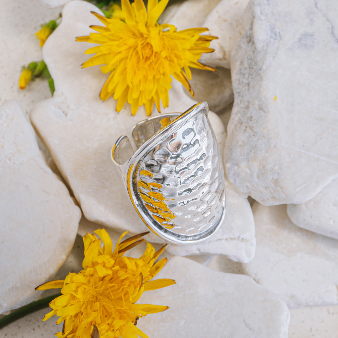 The Elemental Shield Ring is a bold sterling silver statement piece that radiates strength and free-spirited energy. Its large hammered shield design curves gracefully around the finger, catching the light with every movement, while the tapered open band ensures both comfort and an adjustable fit made just for you. Powerful yet effortless, this ring feels like wearing a piece of the earth’s raw beauty — a talisman of courage, freedom, and untamed spirit.