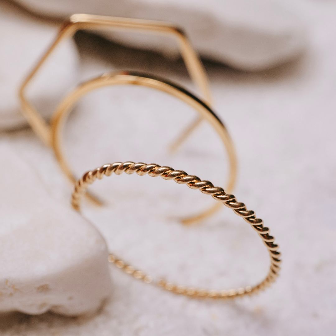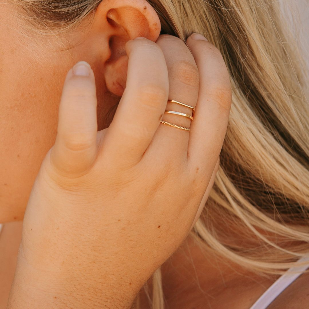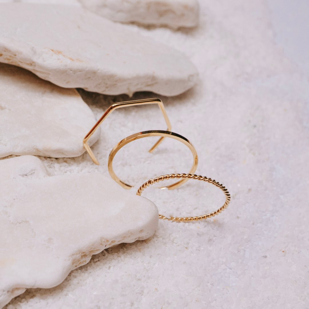 Like warm light stretching across open sands, the Desert Sun Stack is a little trio made for wanderers at heart. Three delicate gold rings — a soft smooth band, a twisted rope, and a sun-inspired geometric shape — layer together in effortless harmony, yet each one can be worn alone for a more minimal glow. Crafted to be waterproof, they’re made for salty swims, sunlit adventures and everyday living without the worry. Light, earthy and endlessly versatile, this stack carries that sun-kissed, free-spirited feeling wherever your journey leads.